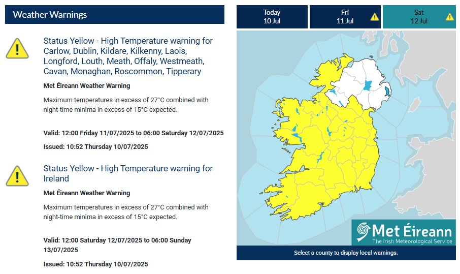 Državni hidrometeorološki zavod Republike Irske izdao je žuta upozorenja na visoke temperature za sljedeća dva dana.