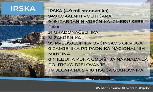 Ukratko, dok u Hrvatskojdolazi jedan lokalni vijećnik na 500 stanovnika, u Irskoj jedan vijećnik u prosjeku pokriva od 5000 do 10.000 građana.