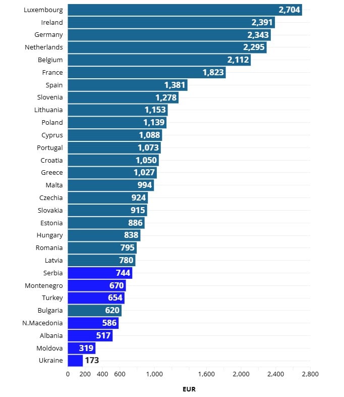 Prema procjeni Euronewsa temeljenoj na podacima Eurostata, među državama članicama EU-a, mjesečna bruto minimalna plaća kreće se od 620 eura u Bugarskoj do 2704 eura u Luksemburgu. Kad se uključe zemlje kandidatkinje, Ukrajina je iznimka sa 173 eura, a slijedi je Moldavija s 319 eura.