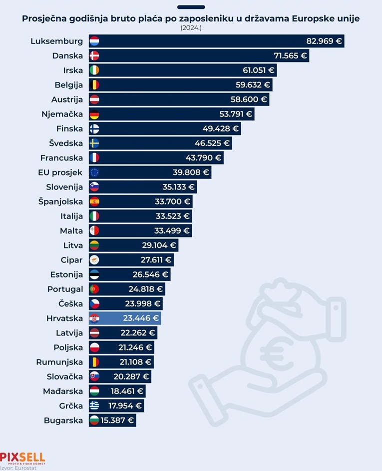 Osim Luksemburga, prosječnu plaću iznad 50.000 eura bilježi još pet zemalja: Danska, Irska, Belgija, Austrija i Njemačka. Hrvatska se nalazi očekivano ispod prosjeka, prosječna je plaća 23.446 eura. Na dnu ljestvice, uz Bugarsku, nalaze se Grčka i Mađarska, gdje je prosječna godišnja plaća manja od 20.000 eura.
