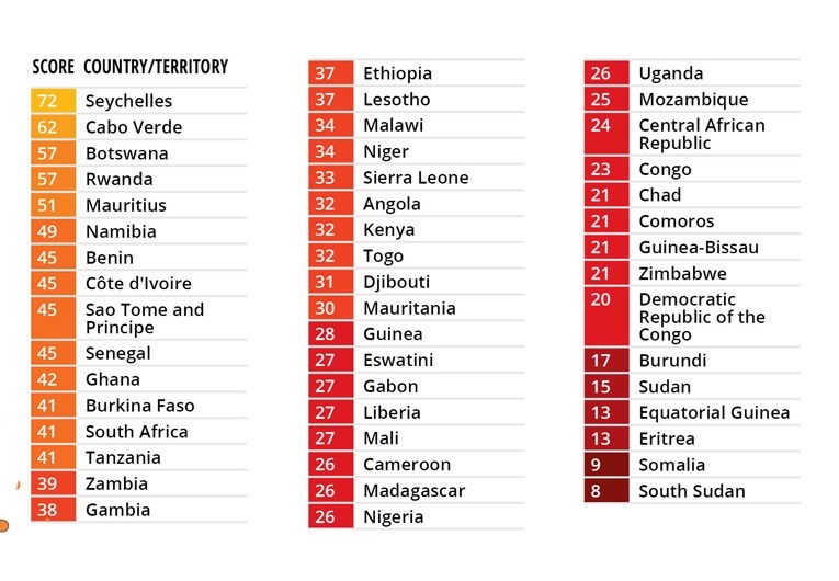 Zemlje s najnižim vrijednostima se nalaze uglavnom u fragilnim regijama svijeta u kojima su prisutni i razni konflikti: na primjer Južni Sudan (8 od 100), Somalija (9), Venezuela (10), Sirija (12), Libija (13), Eritrea (13) odnosno Jemen (13) i Ekvatorijalna Gvineja (13).