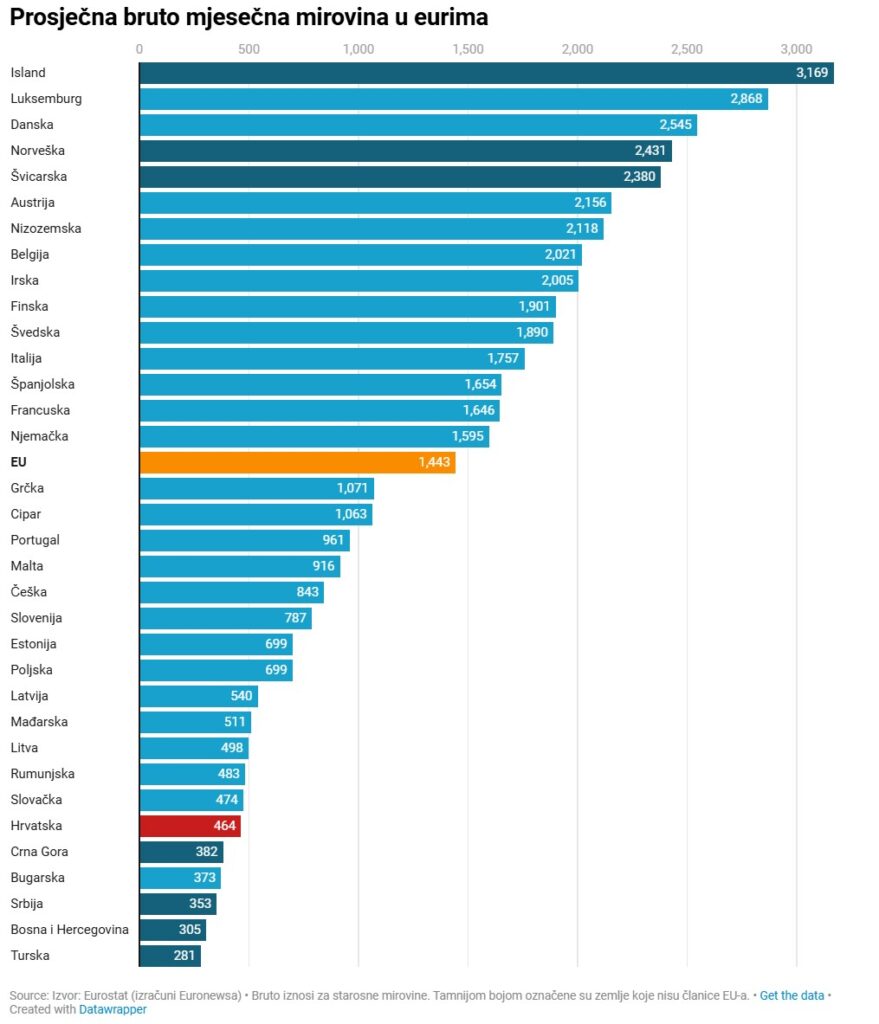Hrvatska se nalazi na dnu ljestvice, u skupini zemalja gdje je prosječna mirovina niža od 8.000 eura godišnje. U tom su društvu i Bosna i Hercegovina, Srbija, Crna Gora, Slovačka, Rumunjska, Litva, Mađarska i Latvija. S druge strane, četiri najveća gospodarstva EU-a – Italija, Španjolska, Francuska i Njemačka – nalaze se nešto iznad prosjeka Unije, kao i svih pet nordijskih zemalja. Irska se nalazi znatno iznad europskog prosjeka i to sa prosječnim iznosom od 2,005 eura.